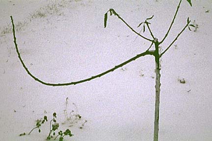 "flopped" twig was not too severly broken they made lots of callus to repair the damage. The most peculiar part of this whole enigma is that tree to tree differences within a row are very evident, indicating it is genetic in nature -- since the main purpose of the trials is variety evaluation.