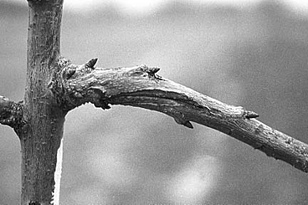 Some varieties have none, but some are quite severe, and first year trees have most of the top branches affected and 2-4 year olds have a few of the top new twigs on the leader and on secondary laterals also affected. I suppose that we might have just passed off these symptoms as wind damage in most years, but since they were much more severe in one site than another and had such varietal differneces in symptom levels, we became suspicious that a physiological effect was involved, possibly due to a pesticide secondary effect. I'm still very much in the dark as to what is the cause. In my pomological opinion it is not just wind, although it is worst on the west side of trees and in more windy sites. A 2nd leaf orchard and a 1st leaf orchard at other Geneva-region farms had liitle or no signs of this disorder.